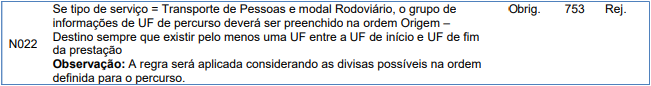 Verifique durante a emissão deste CT-e, se tipo de serviço = Transporte de Pessoas e modal Rodoviário, o grupo de informações de UF de percurso deverá ser preenchido na ordem Origem – Destino sempre que existir pelo menos uma UF entre a UF de início e UF de fim da prestação.