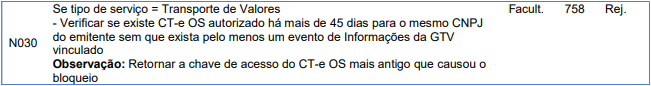 Rejeição 758: Existe CT-e OS de Transporte de Valores autorizado há mais de 45 dias sem informar as GTV (CT-e)
