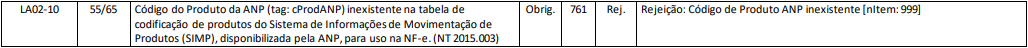 Essa rejeição ocorre ao emitir uma NF-e para Operação com Combustíveis e for informado um Código de Produto ANP (cProdANP) inexistente.
