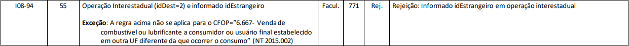 Quando for emitida uma NF-e com Indicador de Destino da Operação (IDE / idDest = 2 - "Interestadual”) e for informado o campo (DEST / idEstrangeiro) como identificador do Destinatário será retornado à rejeição.