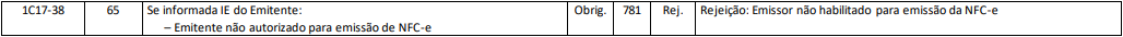 Rejeição 781: Emissor não habilitado para emissão da NFC-e (NFC-e)