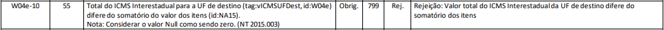 Rejeição 799: Valor total do ICMS Interestadual da UF de destino difere do somatório dos itens (NF-e)