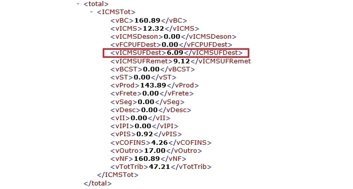 vICMSUFDest [Item 1] + vICMSUFDest [Item 2] + vICMSUFDest [Item n] = vICMSUFDest [Total]