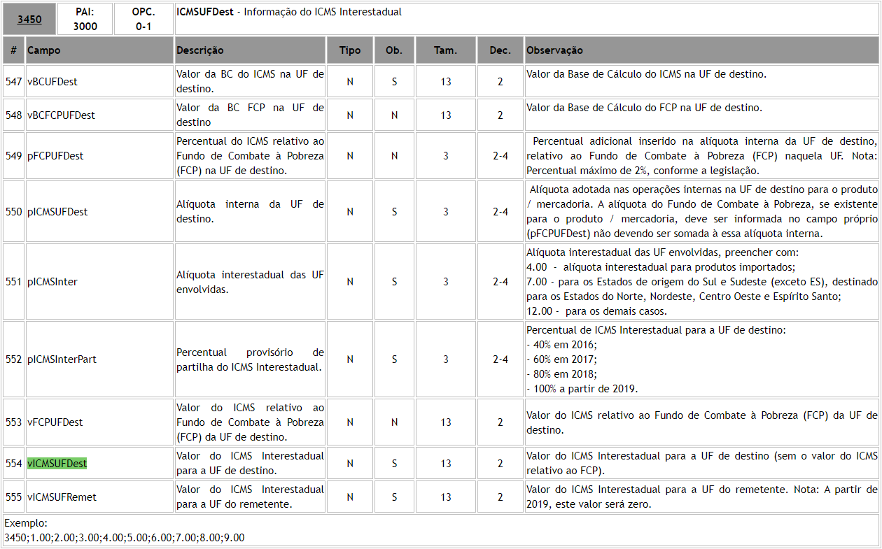 Para clientes que emitem o arquivo em TXT o campo vICMSUFDest é referente a linha 3450 e está localizado no 8º campo, conforme podemos visualizar abaixo nos manuais da NDD Tech.