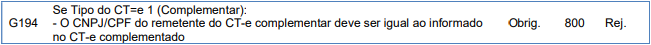 Rejeição 800: CNPJ/CPF do remetente do CT-e complementar deve ser igual ao informado no CT-e complementado (CT-e)
