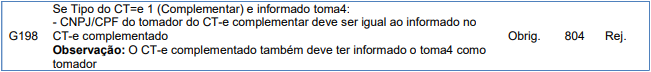 Rejeição 804: O CNPJ/CPF do tomador do CT-e complementar deve ser igual ao informado no CT-e complementado (CT-e)