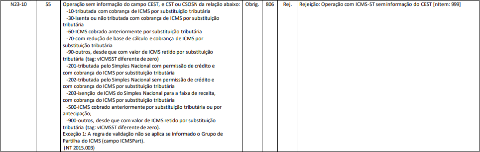 Quando emitida uma NF-e de Operação sem a informação do Código Especificador da Substituição Tributária - CEST e o CST ou o CSOSN de ICMS for obrigatória a informação referente ao CEST, irá retornar à rejeição 806.