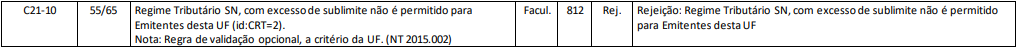 Essa rejeição ocorre quando for emitida uma NF-e por Contribuinte do Regime Tributário Simples Nacional e for informado o Código do Regime Tributário (CRT) igual a "2 - Simples Nacional, excesso sublime de receita bruta" e a UF não permite essa informação.