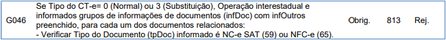 Verifique durante a emissão deste CT-e, se tipo do CT-e= 0 (Normal) ou 3 (Substituição), Operação interestadual e informados grupos de informações de documentos (infDoc) com infOutros preenchido, para cada um dos documentos relacionados: