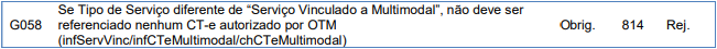 Rejeição 814: Não devem ser informados CT-e Multimodais para Tipo de Serviço diferente de Serviço Vinculado a Multimodal (CT-e)