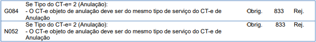 Rejeição 833: O tipo de serviço do CT-e de anulação deve ser igual ao CT-e original (CT-e)