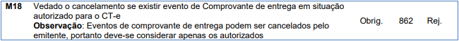 Rejeição 862: Vedado o cancelamento quando houver evento de Comprovante de Entrega associado (CT-e)