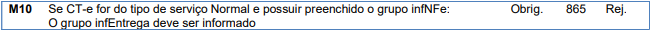 Rejeição 865: Comprovante de entrega deve relacionar NF-e para CT-e de tipo de serviço Normal (CT-e)
