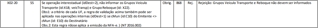 Verifique durante a emissão desta NF-e, onde é operação interestadual (tag: idDest = 2), pois não é permitido informar os Grupos Veiculo Transporte (tag: veicTransp) e Reboque (tag: reboque).