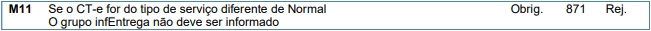 Rejeição 871: Comprovante de entrega não pode informar NF-e para CT-e de tipo de serviço diferente de Normal (CT-e)