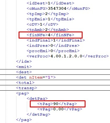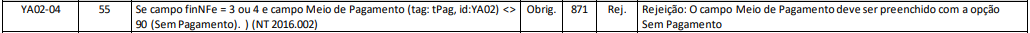 Quando for emitida uma NF-e, onde a sua Finalidade de Emissão for igual a Devolução, Retorno ou NF-e de Ajuste, porém no campo Forma de Pagamento foi informado um valor diferente de 90 (Sem Pagamento), irá retornar à rejeição 871.