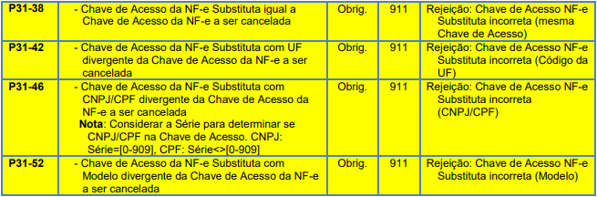 Nota: Considerar a Série para determinar se CNPJ/CPF na Chave de Acesso. CNPJ: Série=[0-909], CPF: Série<>[0-909]Chave de Acesso da NF-e Substituta com Modelo divergente da Chave de Acesso da NF-e a ser cancelada.
