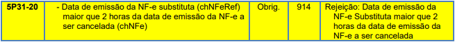 Rejeição 914: Data de emissão da NF-e Substituta maior que 2 horas da data de emissão da NF-e a ser cancelada (NFC-e)