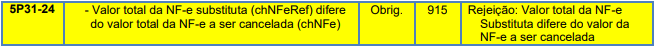 Rejeição 915: Valor total da NF-e Substituta difere do valor da NF-e a ser cancelada (NFC-e)