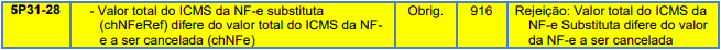 Rejeição 916: Valor total do ICMS da NF-e Substituta difere do valor da NF-e a ser cancelada (NFC-e)