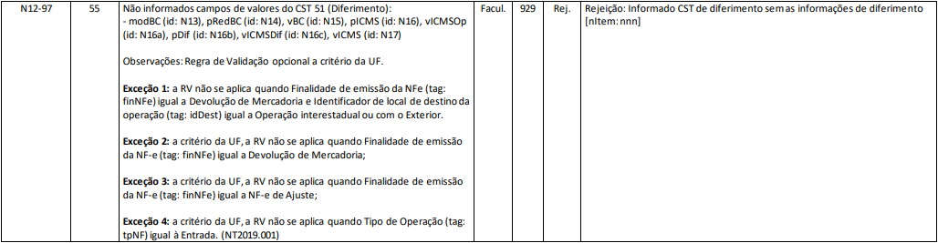 A critério da UF, a RV não se aplica quando Finalidade de emissão da NF-e (tag: finNFe) igual a NF-e de Ajuste; Exceção 4: a critério da UF, a RV não se aplica quando Tipo de Operação (tag: tpNF) igual à Entrada (NT2019.001).