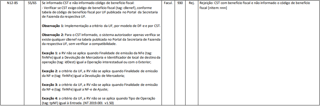 Verificar se CST exige código de benefício fiscal (tag: cBenef), conforme tabela de código de benefício fiscal por UF publicada no Portal da Secretaria de Fazenda da respectiva UF.
