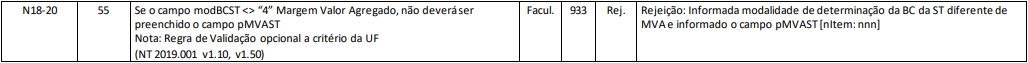 Regra de Validação opcional a critério da UF (NT 2019.001 v1.10, v1.50)