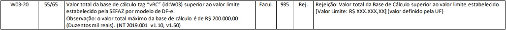 Valor total da base de cálculo tag “vBC” (id:W03) superior ao valor limite estabelecido pela SEFAZ por modelo de DF-e.