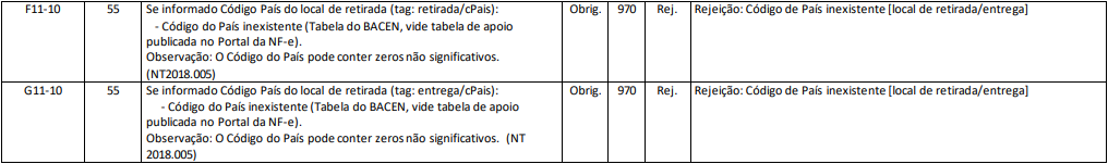 Rejeição 970: Código de País inexistente [local de retirada/entrega] (NF-e)