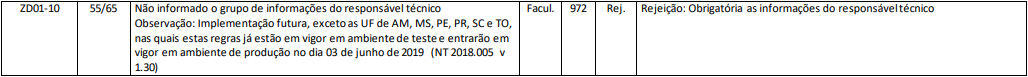 Implementação futura, exceto as UF de AM, MS, PE, PR, SC e TO, nas quais estas regras já estão em vigor em ambiente de teste e entrarão em vigor em ambiente de produção no dia 03 de junho de 2019 (NT 2018.005 v 1.30).