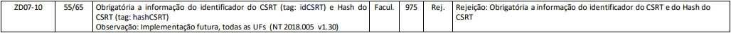 Obrigatória a informação do identificador do CSRT (tag: idCSRT) e Hash do CSRT (tag: hashCSRT).