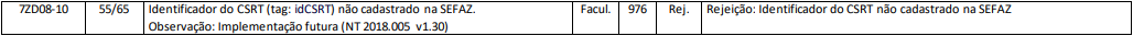 Identificador do CSRT (tag: idCSRT) não cadastrado na SEFAZ.