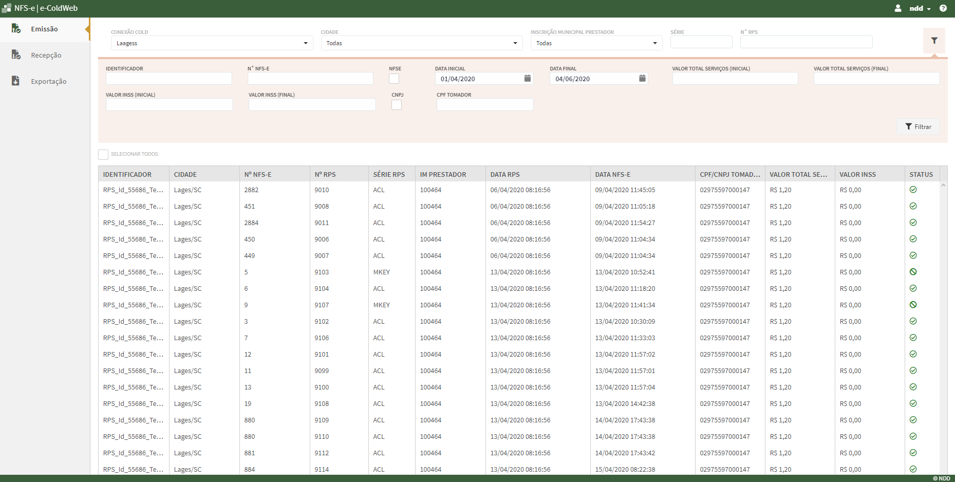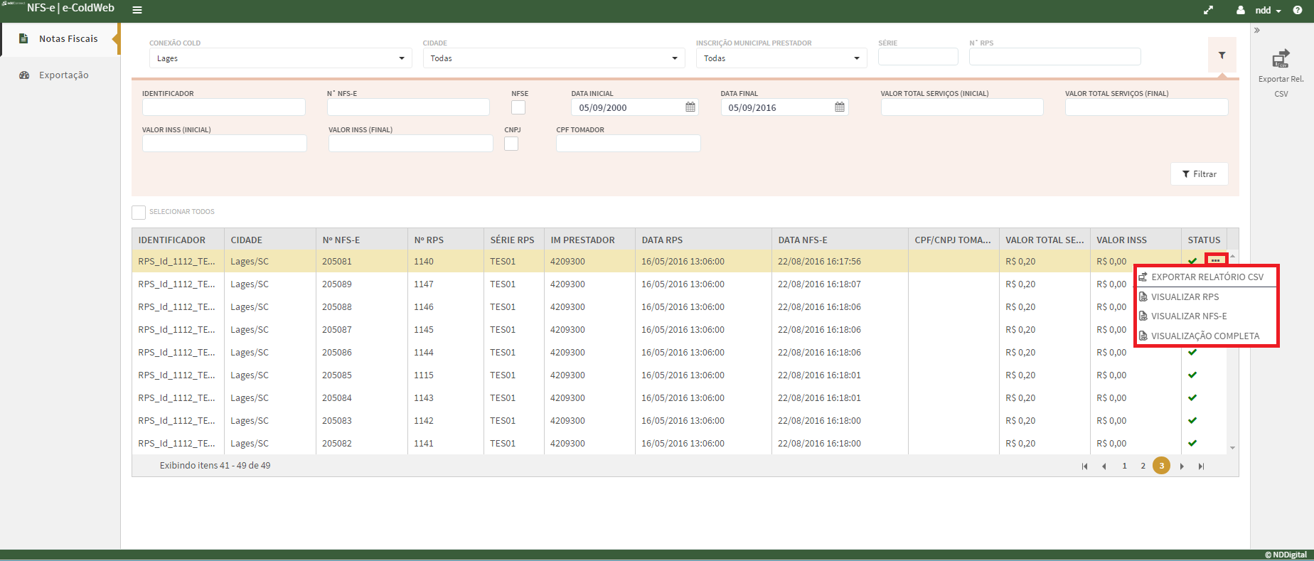 A aba de Notas Fiscais é utilizada para visualização de documentos autorizados e cancelados inseridos no cold.