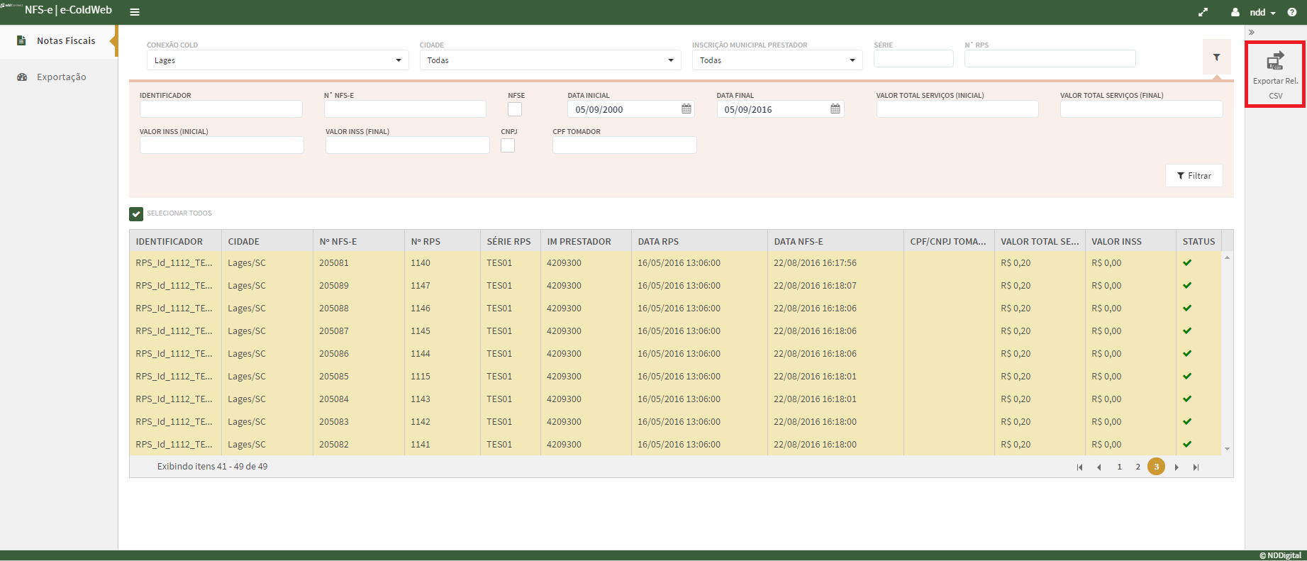 A funcionalidade de exportação de relatório foi criada com o intuito de poder realizar a exportação dos documentos que são apresentados na aba de Documentos Inválidos, o qual apresenta os erros de validação que é gerado pelo NFS-e Input. O relatório será gerado no formato de .CSV, onde são exibidos os documentos conforme pesquisa realizada na aba de Documentos Inválidos.