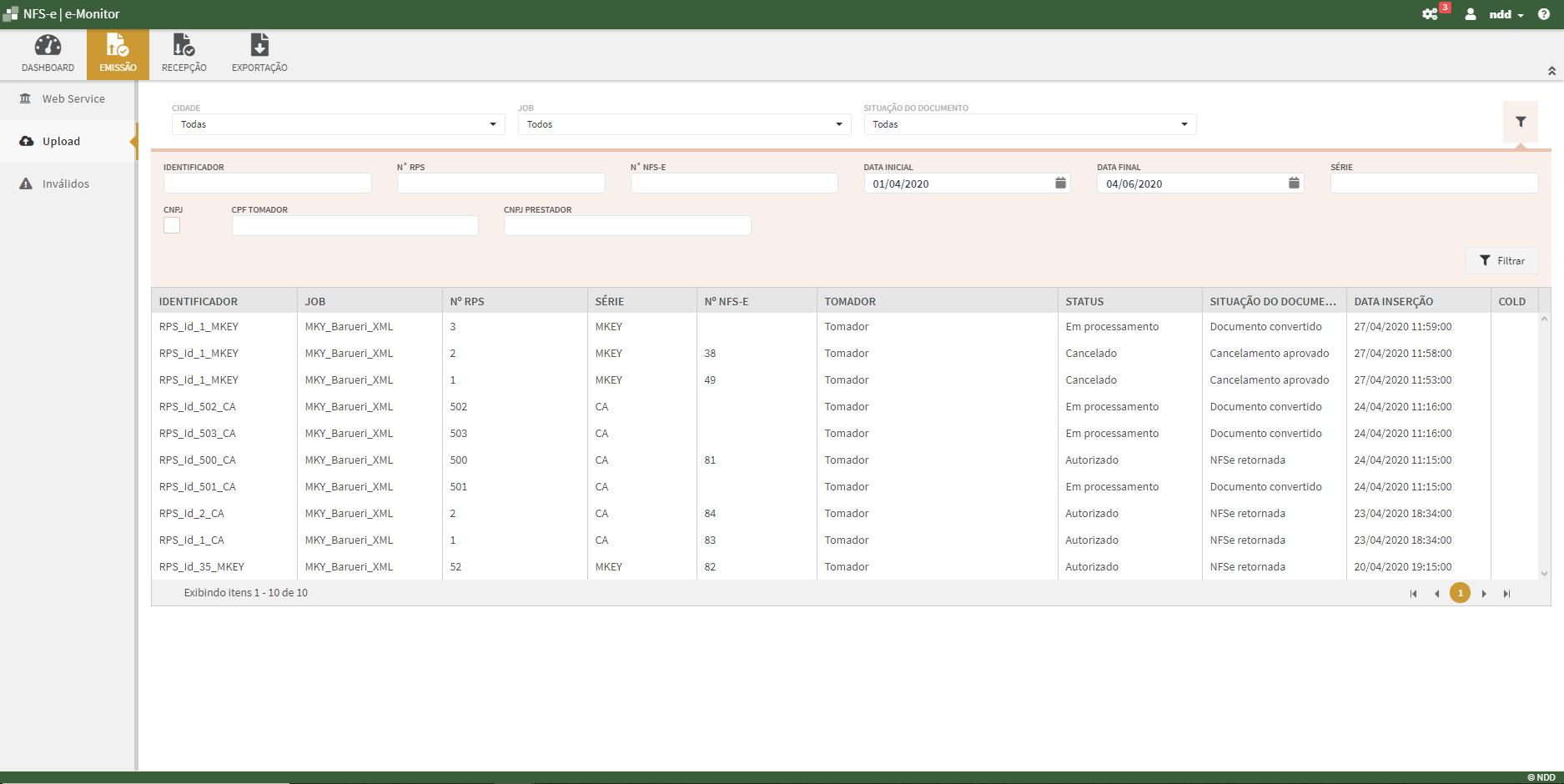 A sub aba de Upload é utilizada para visualização de documentos via Upload, Documentos Autorizados, Documentos cancelados e Documentos em processamento.