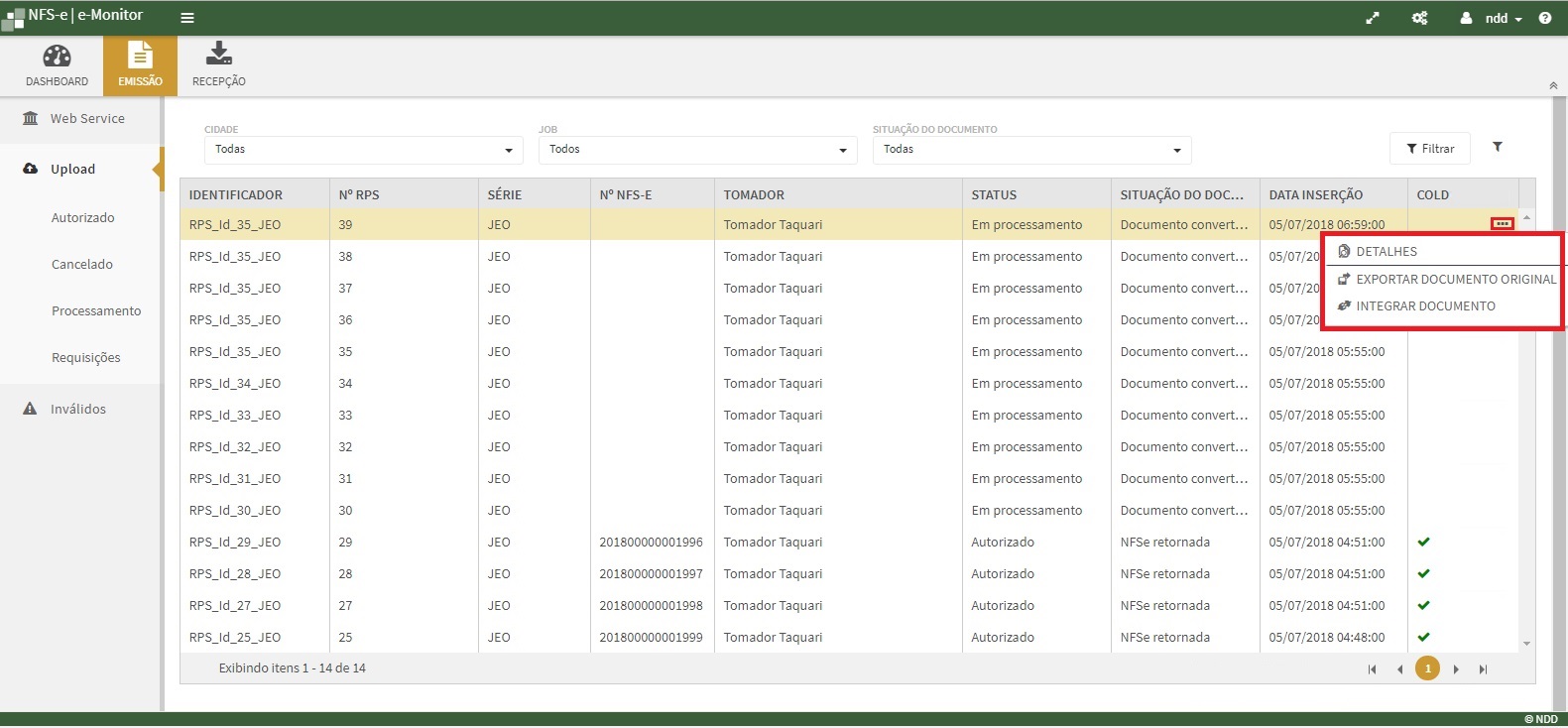 Para visualizar os Detalhes do documento, selecione um registro no grid e clique sobre reticências (...), localizado no final da linha na coluna do Cold, em seguida clique em Detalhes. Através do reticências (...) também é possível realizar exportação do Documento Original, XML de RPS, XML NFSe, Exportar Documento Cancelado, Reimprimir NFS-e e Reimprimir RPS. Além disso o usuário também pode realizar o Cancelamento da NFS-e e a Integração do Documento, conforme seu status.