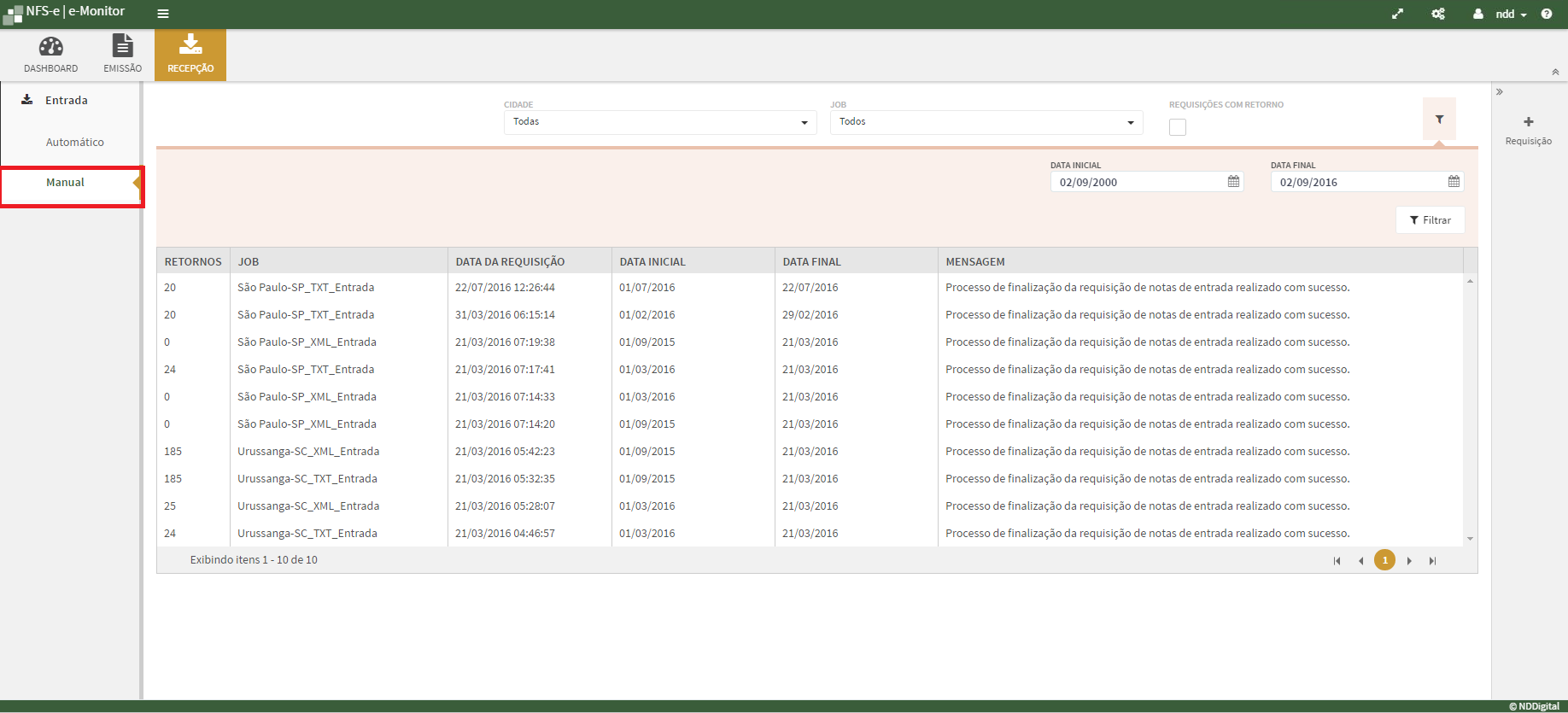 Na aba Manual são apresentados os processos de NFS-e de Entrada quando a solicitação de notas tomadas for através do NFS-e e-Monitor.