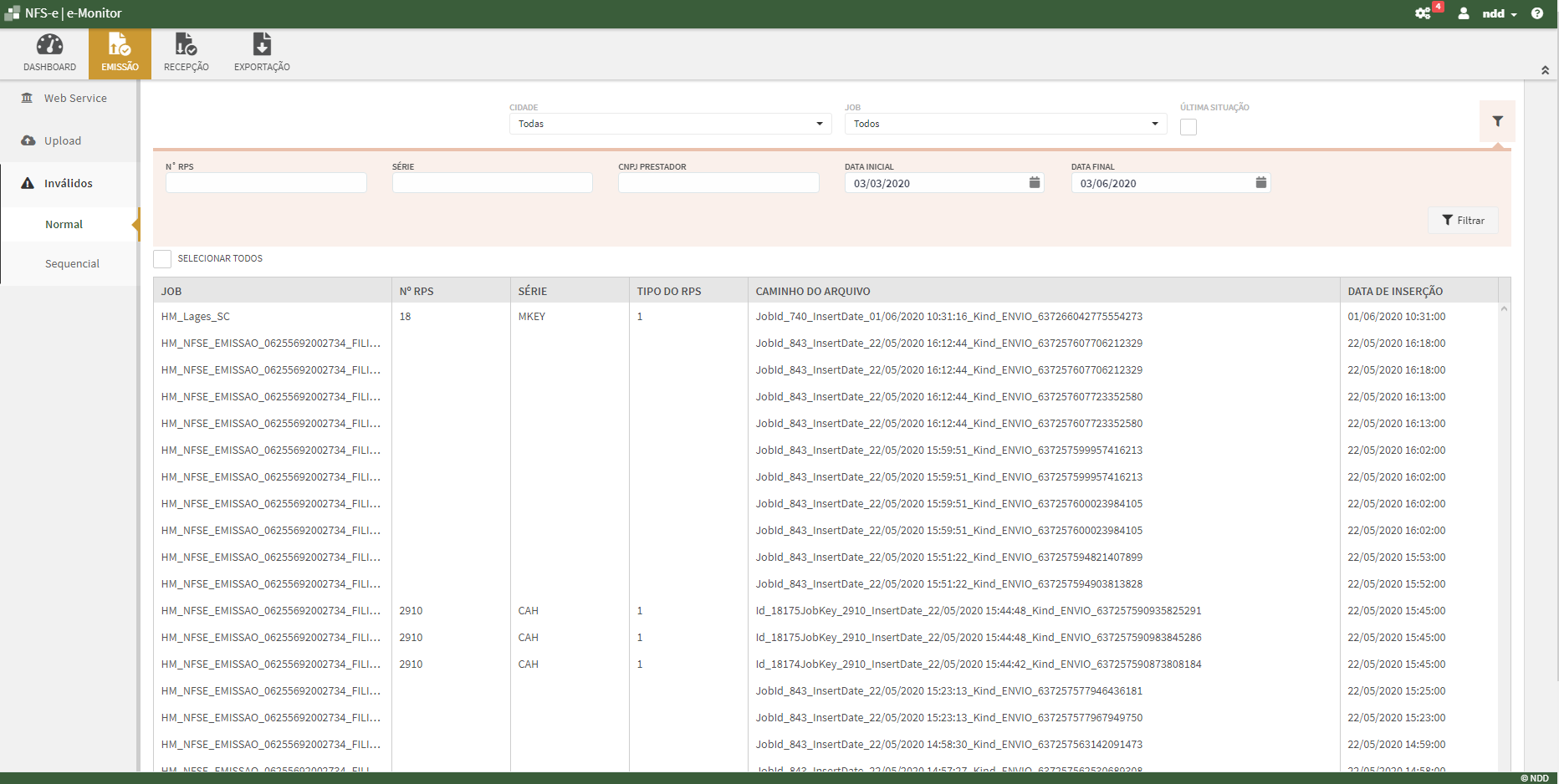 Documentos Inválidos dispõe dos seguintes filtros:
