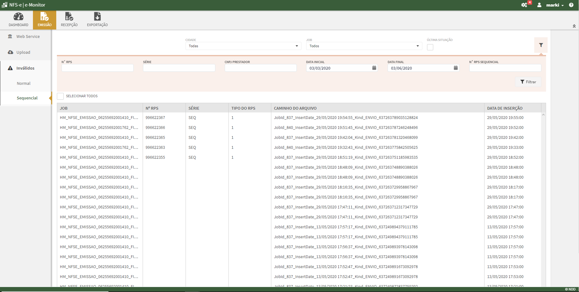 Documentos Inválidos Sequencial dispões dos seguintes filtros: